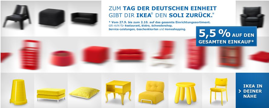 Anlässlich des Tages der Deutschen Einheit (am 3. Oktober) gibt es jetzt in allen deutschen IKEA Einrichtungshäusern eine Woche lang 5,5 % auf alle Produkte. Das entspricht passenderweise genau der Höhe des aktuellen Solidaritätszuschlags! 😉 Gültig vom 27.09. bis 02.10.2010! Ihr müsst nichts weiter tun…wird automatisch an der Kasse abgezogen. Nicht gültig für den Schwedenshop, im Restaurant, auf Geschenkkarten oder fürs Onlineshopping.